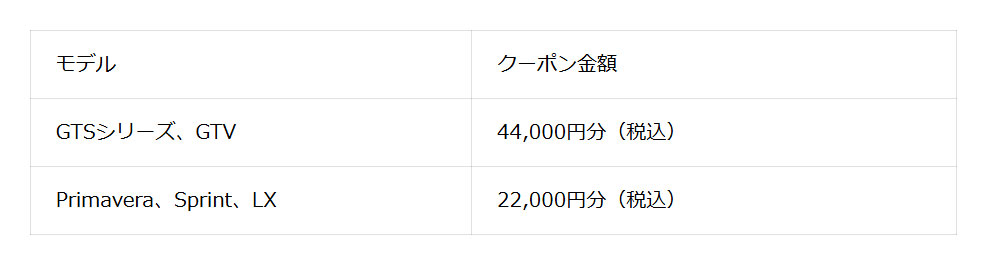 | 詳細 | ピアッジオグループジャパンは、ベスパ新車購入者を対象としたキャンペーン『NEW START, NEW RIDE』を2026年3月28日(土)より全国のベスパ正規販売店で開始します。同キャンペーンは、期間中にベスパの新車を購入した顧客に対し、22,000円から44,000円(税込)分の純正アクセサリー購入クーポンが提供されるというもの。 『NEW START, NEW RIDE』は、125㏄から300㏄まで幅広いラインナップを揃えたベスパの各モデルの魅力をさらに引き立てるとしています。同クーポンを利用することで、購入者は自分好みの実用的で快適な1台を手に入れることが可能となり、新しいベスパでのライフスタイルを楽しめるとしています。 ◆タイトル : ベスパNEW START, NEW RIDE キャンペーン ◆実施期間 : 2026年3月28日(土)から6月30日(火)までのご成約 ◆対象モデル : GTSシリーズ、GTV、Primavera、Sprint、LX各モデルの新車※1 ◆内 容 : 実施期間中にベスパの新車をご成約で、車種に応じた金額の純正アクセサリー購入クーポン※2をプレゼント。 ![]() ※1 2026年モデルは対象外です ※2 アクセサリーなどの取付工賃は、お客様のご負担となります。 ※在庫状況によっては、ご希望のアクセサリーが納車時にお渡しできない場合がございます。 ※クーポンはベスパの純正品の購入以外には使用できません。 ◆詳細は 公式ページ をご覧ください。 |